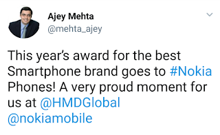 Recently Nokia got an award of best Smartphone of the year 2017 and Juho Sarvikas ceo of HMD and Ajay Mehta ceo of HMD India recently announced this with their tweets.